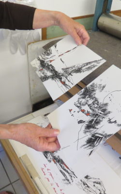Sa démarche commence par la peinture et très vite dévie sur la gravure pour compléter son expression. Le dessin se rajoute comme une vérité nécessaire.